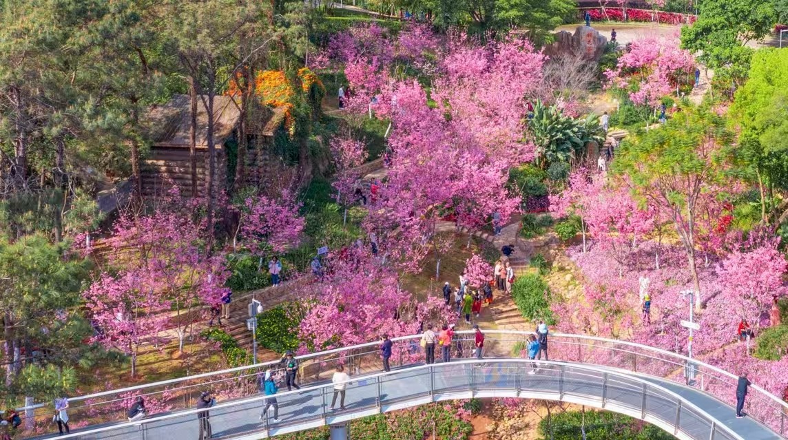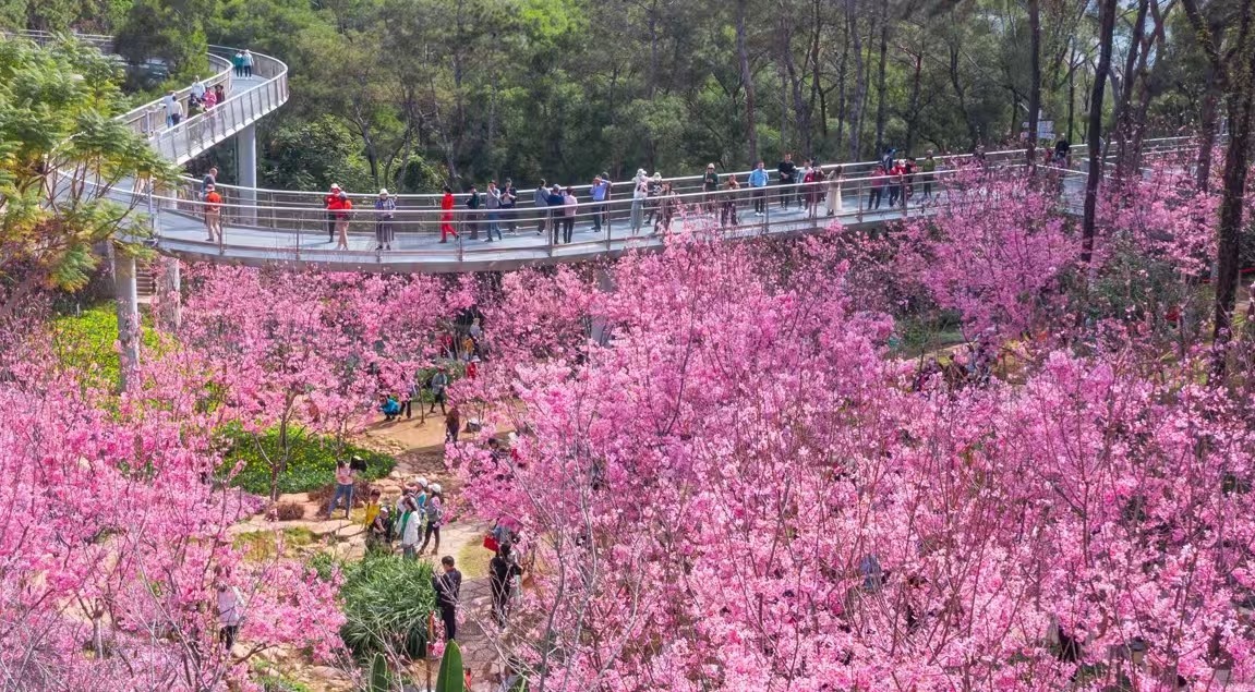 近日,建發(fā)城服所屬山海步道公司負(fù)責(zé)管養(yǎng)的云海線狐尾山段櫻花谷內(nèi),上百株櫻花進(jìn)入盛花期。此處種植的櫻花以廣州櫻為主,花期預(yù)計(jì)持續(xù)到3月底。