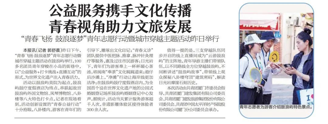 6月21日,由共青團(tuán)廈門市委員會指導(dǎo),共青團(tuán)廈門建發(fā)集團(tuán)有限公司委員會、共青團(tuán)廈門建發(fā)旅游集團(tuán)股份有限公司委員會、共青團(tuán)中國太平洋財(cái)產(chǎn)保險(xiǎn)股份有限公司廈門分公司委員會承辦的“青春飛揚(yáng) 鼓浪逐夢”青年志愿行動(dòng)暨城市穿越主題活動(dòng)圓滿舉行。《廈門晚報(bào)》以《公益服務(wù)攜手文化傳播 青春視角助力文旅發(fā)展》為題進(jìn)行了相關(guān)報(bào)道,特摘錄分享。
