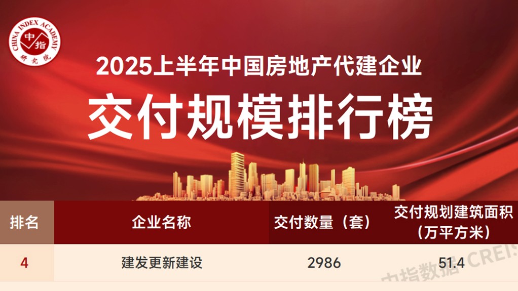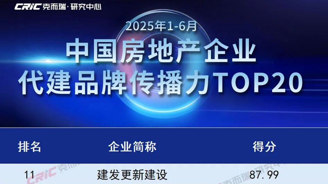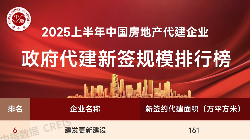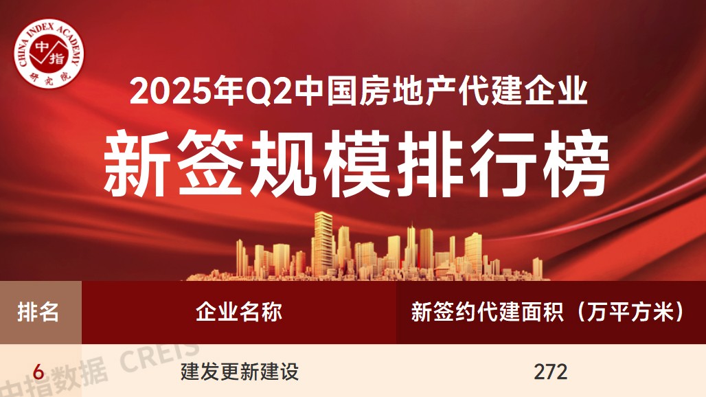 7月8日,中指研究院與克而瑞研究中心分別發(fā)布上半年房地產代建行業(yè)榜單。建發(fā)更新建設獲評 “2025上半年中國房地產代建企業(yè)新簽規(guī)模TOP12”“Q2新簽規(guī)模 TOP6”“政府代建新簽規(guī)模TOP6” “交付規(guī)模TOP4”;獲評克而瑞“2025年1-6月代建新增規(guī)模TOP11” “品牌傳播力TOP11”。