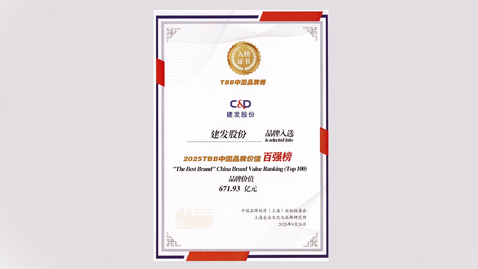近日,2025 TBB·中國(guó)品牌價(jià)值百?gòu)?qiáng)榜在上海發(fā)布,建發(fā)股份(600153.SH)再度登榜,以671.93億元的品牌價(jià)值位列第66名。未來(lái),建發(fā)股份將繼續(xù)錨定“中國(guó)式商社,全球化建發(fā)”品牌定位,堅(jiān)持專(zhuān)業(yè)化經(jīng)營(yíng)與國(guó)際化發(fā)展戰(zhàn)略,以資源力、服務(wù)力鞏固核心競(jìng)爭(zhēng)優(yōu)勢(shì),同時(shí)以長(zhǎng)期主義助力品牌建設(shè),讓專(zhuān)業(yè)、值得信賴(lài)的企業(yè)品牌形象更加深入人心。